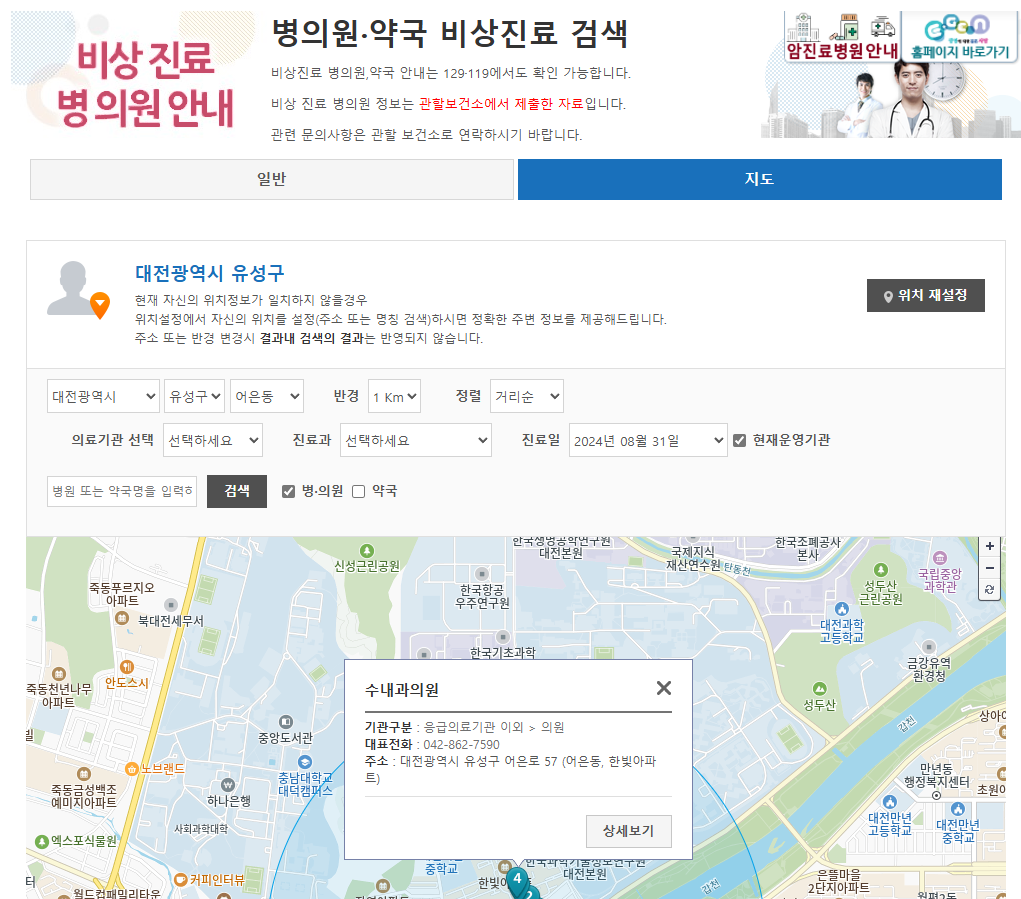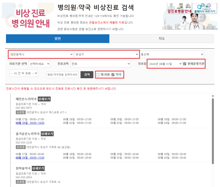 해당하는 지역을 선택한 뒤, 날짜, 병의원과 약국을 선택한 뒤 검색하면 현재 진료 중인 병의원 및 약국 목록 확인이 가능합니다.