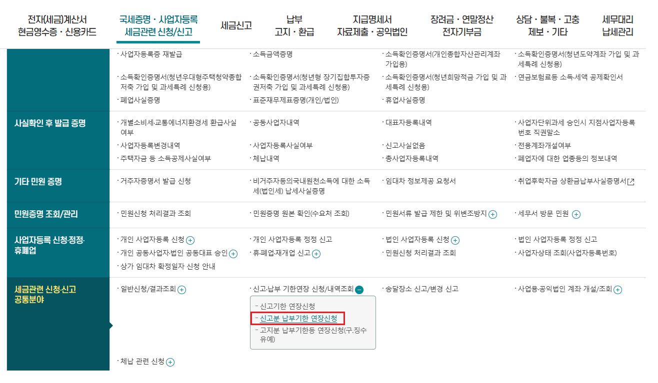 국세증명→세금분야신청→신고분 납부기한 연장 신청