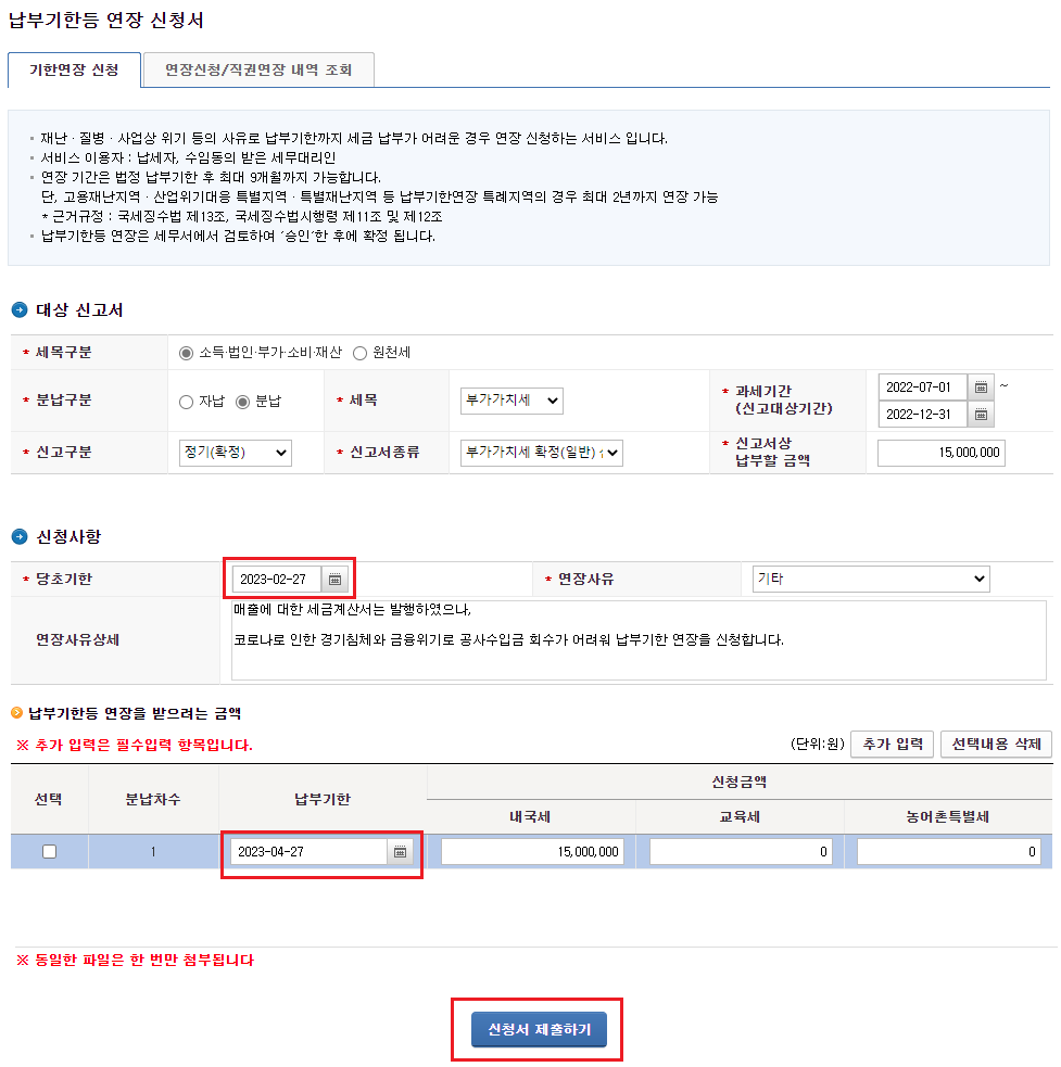 기한연장 신청서에 기본 인적사항을 확인한 뒤 대상 신고서를 작성하고 신청서 제출하기를 눌러 제출합니다.